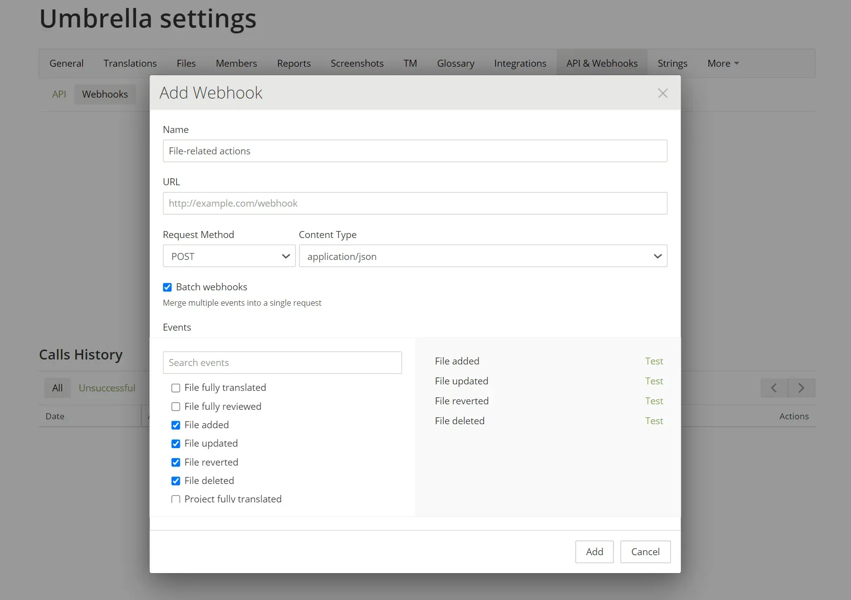 To configure webhooks for a Crowdin project, open the project and go to Settings > API & Webhooks tab > select Webhooks > Add Webhook.