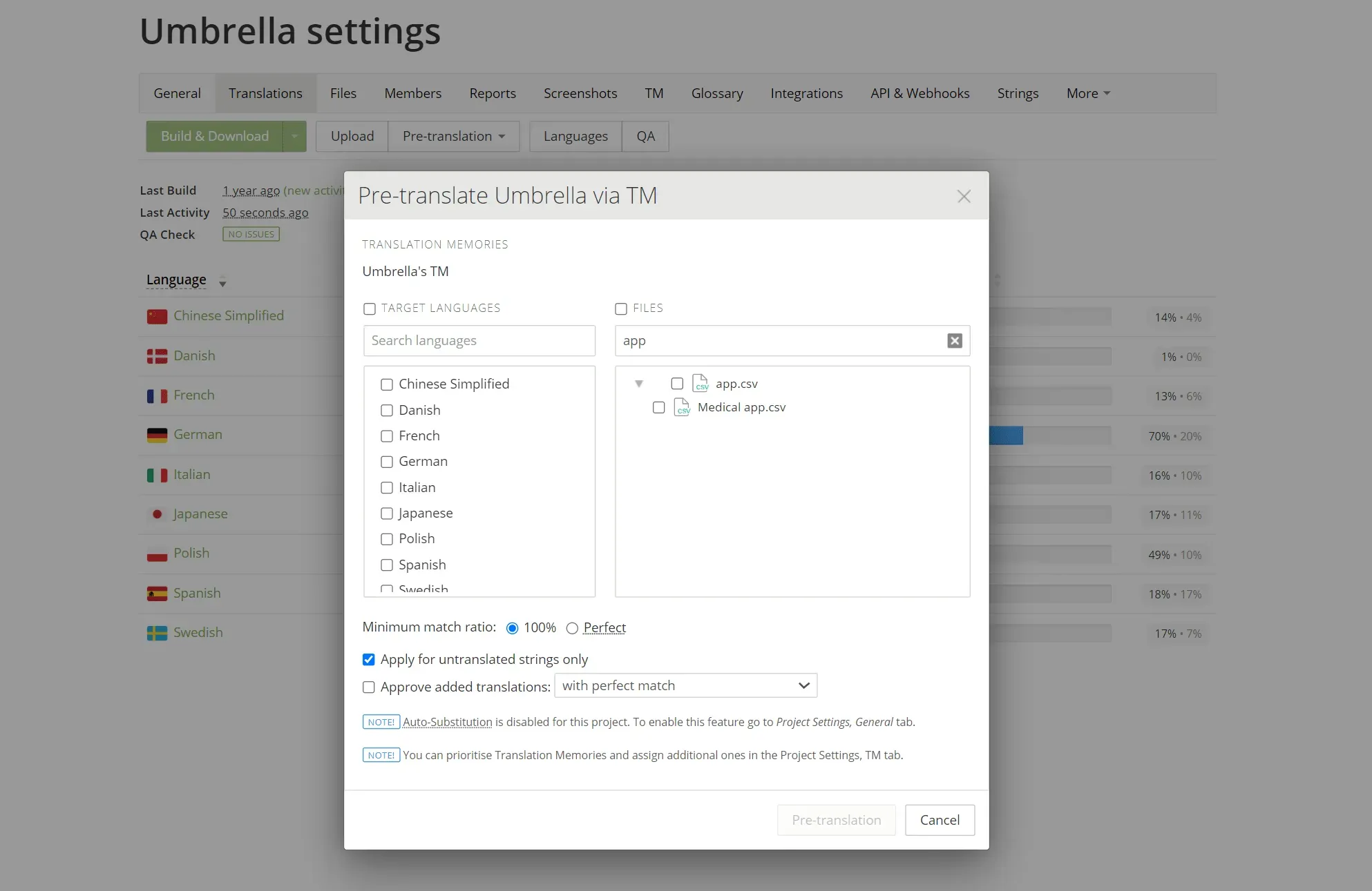 For projects with a rich file structure, it can be time-consuming to select a file from the list of all project files when configuring pre-translate. That is why we added search bars in the Pre-translate window, so now you can search files and languages to pre-translate much faster.