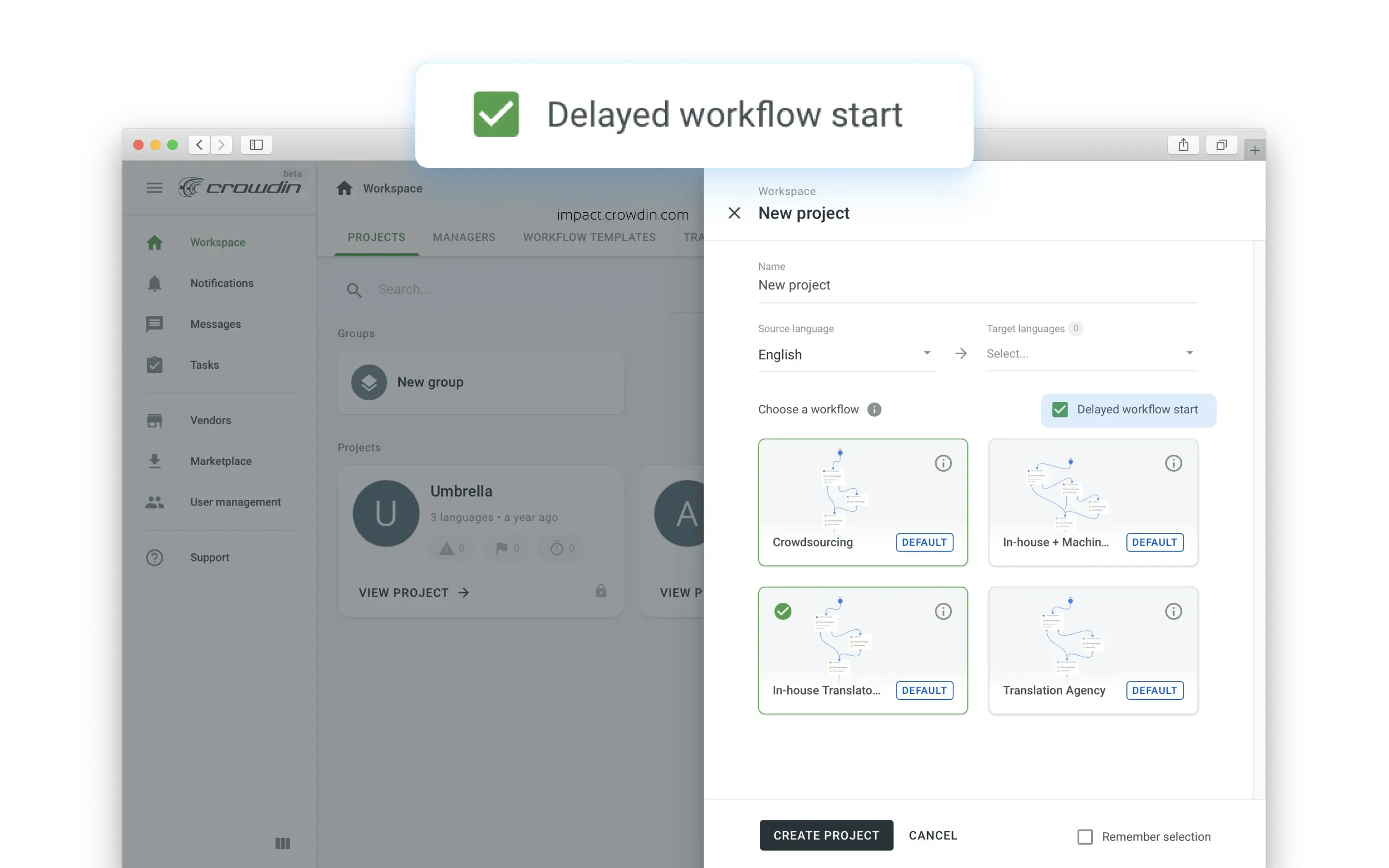 A little reminder. When assigning a workflow to a project, you can delay its start and launch it manually, once ready with files upload, inviting translators, or any other setup. For this, enable the Delayed workflow start when creating a project.